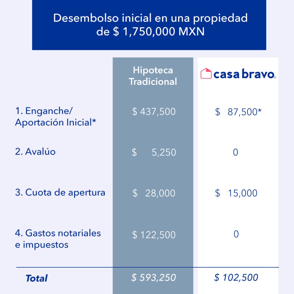1. El enganche. Este es el desembolso inicial mínimo que deberás invertir en tu vivienda para adquirir una hipoteca del valor restante de la propiedad. En 2019, el 80% de los créditos hipotecarios bancarios se otorgaron con un enganche del 20% o mayor. Nosotros estimamos que en promedio, un mexicano puede tardar 15 años en juntar este enganche. Con el programa de Casa Bravo podrás construir tu enganche en máximo 5 años, aportando al inicio desde el 5% del valor de la propiedad.