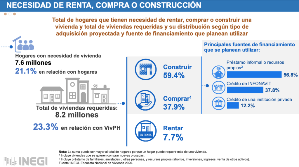 El Instituto Nacional de Estadística y Geografía (INEGI) en conjunto con el Instituto del Fondo Nacional de la Vivienda para los Trabajadores (INFONAVIT) y la Sociedad Hipotecaria Federal (SHF) presentaron recientemente los resultados del levantamiento de la Encuesta Nacional de Vivienda (ENVI) 2020.